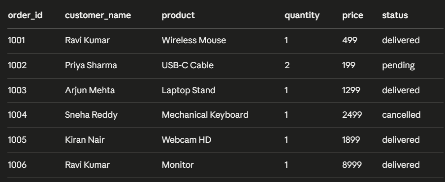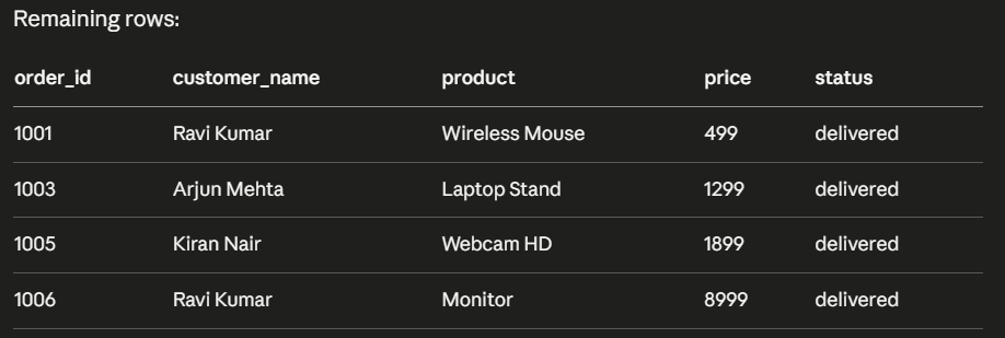 SQL filters rows where status is delivered. Three rows are removed (Priya Sharma (pending) and Sneha Reddy (cancelled) are gone)