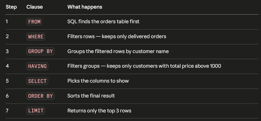 You naturally read it top to bottom. SELECT first, then FROM, then WHERE and so on. So it feels like SQL runs it in that order too. But it does not.