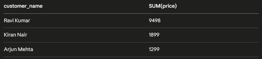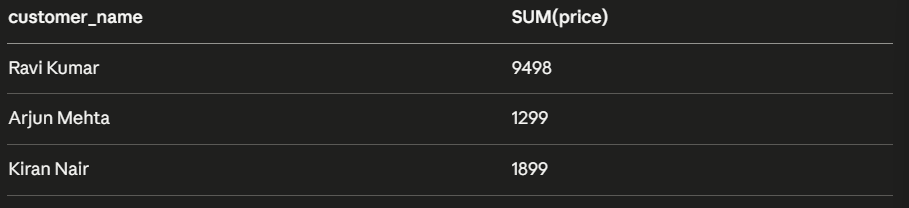 SQL now picks the columns you asked for, which are customer_name and SUM(price).