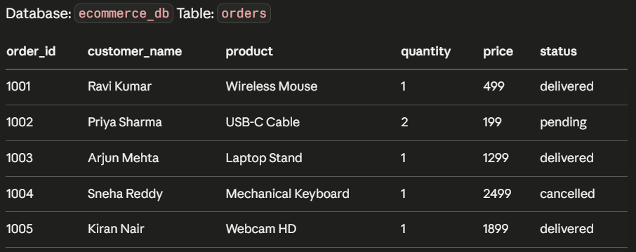 - SELECT customer_name, product FROM orders;
